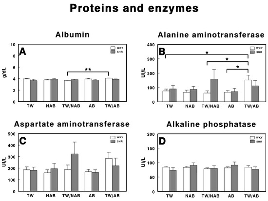 Serum levels of (A) albumin, (B) alanine aminotransferase, (C) aspartate aminotransferase, and (D) alkaline phosphatase in Wistar–Kyoto rats (WKY) and spontaneously hypertensive rats (SHRs). Experimental groups included animals provided with tap water (TW), alcohol-free beer (NAB), tap water or alcohol-free beer at their discretion (TW/NAB), alcoholic beer (AB), or tap water and alcoholic beer at their discretion (TW/AB). Results are expressed in international units per liter (IU/L) for GOT, GPT, and ALP, and in grams per deciliter (g/dL) for albumin (mean ± SEM; n = 8; * p < 0.05; ** p < 0.01).