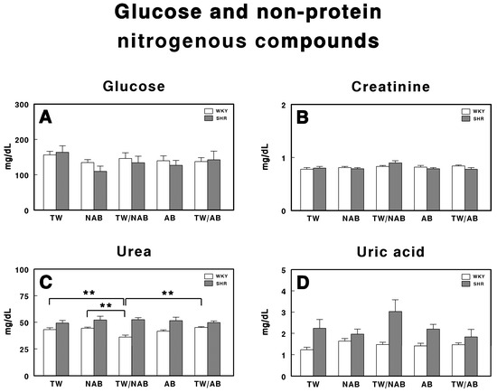 Serum levels of (A) glucose, (B) creatinine, (C) urea, and (D) uric acid in Wistar–Kyoto rats (WKY) and spontaneously hypertensive rats (SHR). Experimental groups included animals provided with tap water (TW), alcohol-free beer (NAB), tap water or alcohol-free beer at their discretion (TW/NAB), alcoholic beer (AB), or tap water and alcoholic beer at their discretion (TW/AB). Results are expressed in milligrams per deciliter (mg/dL) for glucose, creatinine, urea, and uric acid (mean ± SEM; n = 8; ** p < 0.01).