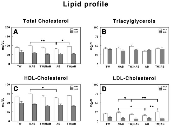 Finally, in Figure 9D, the LDL-cholesterol levels show significant differences between groups only in WKY animals, with higher values in the NAB group and the lowest values in the AB group. As in the whole lipid profile, SHRs showed lower concentrations than WKY animals for all the parameters.