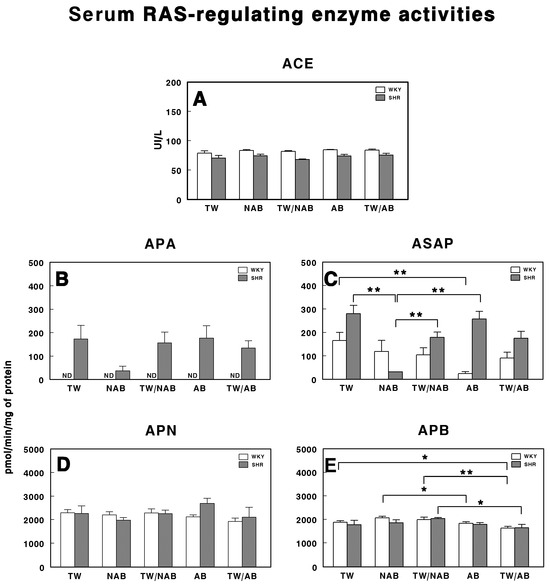 The serum activities of enzymes involved in the regulation of the RAS were assessed in WKY and SHRs across the different experimental groups (TW, NAB, TW/NAB, AB and TW/AB. The enzymes analyzed were ACE, APA, ASAP, APN and APB. Figure 10A shows that there were no significant differences in the ACE activity between WKY and SHRs across all experimental groups. Regarding APA activity (Figure 10B), it was undetectable (ND) in WKY animals for all groups, with the lowest values being found in SHRs receiving NAB. Regarding ASAP (Figure 10C), a significant decrease was found in WKY animals receiving AB (p < 0.01) and in SHRs across several experimental groups. Furthermore, in SHRs, the ASAP levels were higher than those found in WKY, except those receiving NAB. Regarding APN activity (Figure 10D), no significant differences were found between the groups, either in the WKY or SHRs. Finally, Figure 10E shows significant differences in the APB activity for both WKY and SHRs. In SHRs, APB activity was significantly elevated in the TW/NAB compared to the TW/AB group (p < 0.05). In WKY animals, the NAB and TW/NAB groups showed significant higher values compared to both the TW (p < 0.05), AB (p < 0.05) and TW/AB groups (p < 0.01).