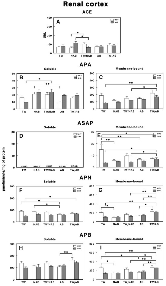 (A) Angiotensin-converting enzyme (ACE) activity, and specific activities of soluble (B) and membrane-bound (C) aminopeptidase A (APA), soluble (D) and membrane-bound (E) aspartyl aminopeptidase (ASAP), soluble (F) and membrane-bound (G) aminopeptidase N (APN), and soluble (H) and membrane-bound (I) aminopeptidase B (APB) in the renal cortex of Wistar–Kyoto rats (WKY) and spontaneously hypertensive rats (SHRs). Experimental groups included animals provided with tap water (TW), alcohol-free beer (NAB), tap water or alcohol-free beer at their discretion (TW/NAB), alcoholic beer (AB), or tap water and alcoholic beer at their discretion (TW/AB). Results are presented as ACE activity in IU/L, and for APA, ASAP, APN and APB, in picomoles of the corresponding aminoacyl-β-naphthylamide hydrolyzed per minute per milligram of protein (mean ± SEM; n = 8; * p < 0.05; ** p < 0.01).