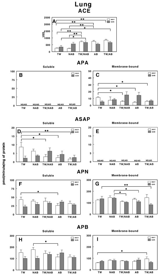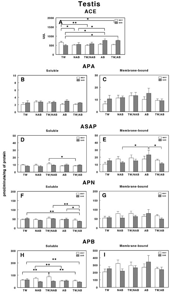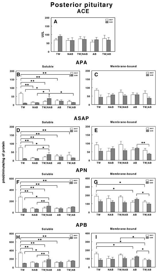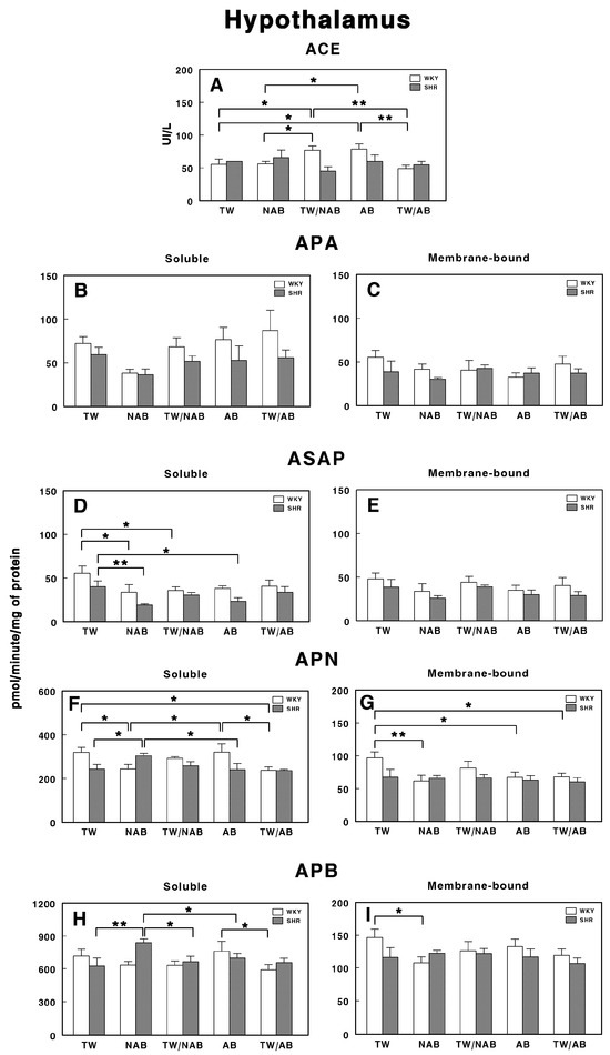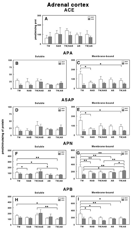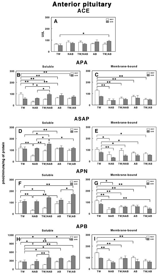 Finally, Figure 11H,I show the APB activity. In the soluble form, a significant increase (p < 0.01) is observed in the TW/AB group compared to the AB group, only in WKY animals. In the membrane-bound form, significant decreases are seen in the NAB (p < 0.05) and AB groups (p < 0.01) in WKY animals, whereas a significant increase in the TW/AB group (p < 0.01) occurs in SHRs.