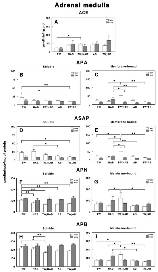 The APN activity, shown in Figure 11, demonstrates significant differences in both its soluble and membrane-bound forms. In the soluble form (Figure 11F), a significant increase (p < 0.05) is observed in the TW/AB group in SHR, whereas a significant decrease (p < 0.05) occurs in the AB group of WKY animals. In the membrane-bound form (Figure 11G), significant decreased levels appear in the NAB (p < 0.05), TW/NAB (p < 0.01) and AB groups (p < 0.05) in WKY animals, whereas the highest levels of APN occur in the TW/AB group in SHRs.