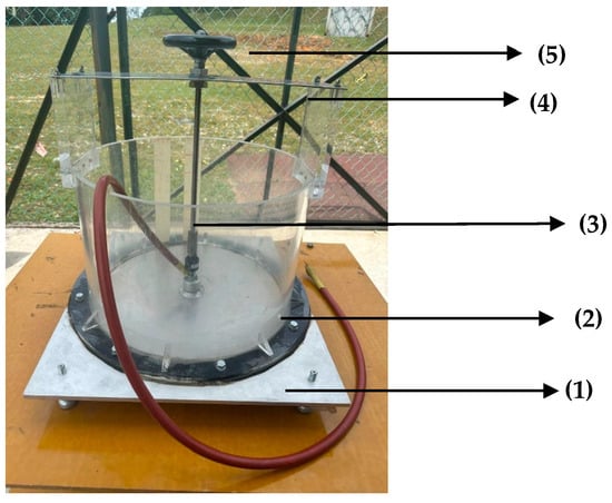 Figure 1 shows the test set cell used in this study, consisting of a parallel plate, with a diameter of 42 cm. The surface of the parallel electrode is kept as uniform as possible to minimize any errors during the measurement of the resistivity and relative permittivity of the low-resistivity mixtures. To ensure that the measurements were not influenced by the sharp edges and non-uniformity of the surfaces of the parallel plates, AC calibration tests were carried out on these parallel plates, which were filled with air, and the results are presented in Section 3. The external materials used in this parallel plate, such as the wall of the plate used to hold the materials, were insulating epoxy materials to ensure that the characteristics of the mixtures were not influenced by these surrounding materials. The bottom electrode was fixed to the bottom of the structure, and only the top electrode, with a handle attached to it, was adjusted to achieve the desired distance between plates.