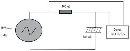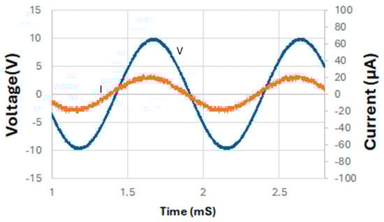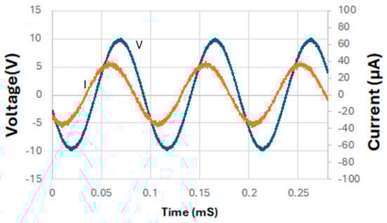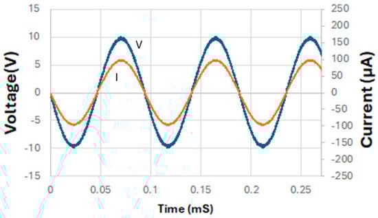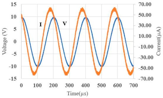 The test circuit is shown in Figure 2. A function generator with a supply voltage of 10 V that can produce frequencies ranging from 50 Hz to 20 kHz was used. Before the experiments were carried out on the low-resistivity mixtures, calibration tests with air-filled gaps were first performed, and the results were compared with the capacitance value, C, calculated from (1), where ε0 is the permittivity of the air, S is the surface area of the plate, given in m2, and d is the gap between the plates, which was 1 cm. During this calibration test with air gaps, due to the high impedance of the test cell and the very small current that could be expected from this measurement, the current measurements were obtained with a shunt resistor with a large resistance of 100 kΩ. Digital storage oscilloscopes (DSOs) were used to capture and record both the voltage and current measurements. Figure 3 shows the voltage and current waveforms at an applied voltage of 10 V and a frequency of 5 kHz. A peak current of 61.82 µA can be seen, which is ahead of the voltage by 90°, indicating its capacitive characteristics. The capacitance value, simply taken as V/I, was found to be 130.13 pF, which is 3.49% different than that calculated using Equation (1), which was 125.58 pF.