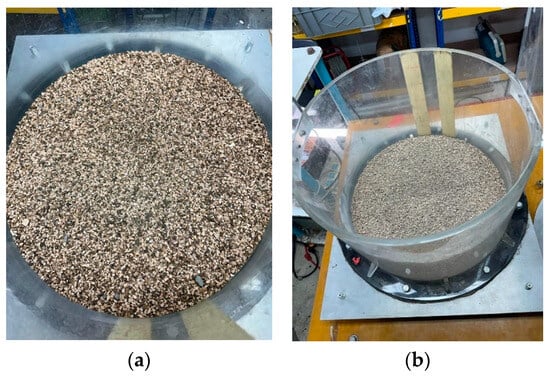 (a) Example of sand mixed with 5%WC and 5%EM1: inside view within the parallel plate setup. (b) Example of sand mixed with dry 5%EM1 within the parallel plate setup.