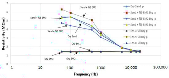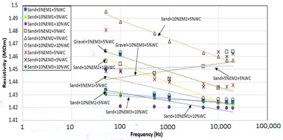 For the sand–EM3 mixtures, the resistivity of sand + 5%EM3 + 5%WC and sand + 10%EM3 + 10%WC decreased with increasing frequency, while the opposite was true for sand + 10%EM3 + 5%WC, which could be due to the high solid composition in sand–EM3 mixtures and the low conductivity of EM3, which is not conductive enough in materials with a low percentage of water content.