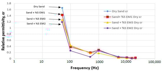 On the other hand, the soil permittivity was found to be highest in dry sand and lowest in sand with 5%EM2 for frequencies below 5 kHz. This is in agreement with several other studies [4,10,11], where, generally, an inverse proportional relationship between the resistivity and permittivity parameters of soil is observed such that when the resistivity of the test medium is higher than that of the other material, the permittivity of the test medium becomes lower than that of the other material, and vice versa. At higher frequencies, the permittivity values for all the test media were found to be similar and independent of frequency, indicating that the test media have similar dielectric strengths.