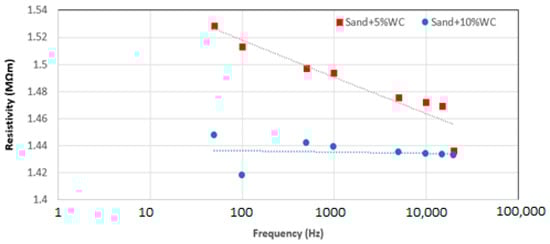 As expected, and can be seen in Figure 10, a higher resistivity was measured in sand mixed with 5%WC than in sand mixed with 10%WC. A significant reduction in resistivity was observed as the frequency increased in the former test medium, while a weak frequency dependence for the latter test medium was observed, which is in agreement with results found in several other studies [4,9], where the decrease in resistivity with frequency is significant in high-resistivity test media. For wet sand mixtures, some inconsistencies were observed, where for most test media, the magnitude of the resistivity decreased with frequency, but for the other test media, it increased with frequency. The degree of the reduction in resistivity varies from one test medium to other, presumably due to differences in the composition of the test media, which leads to different structural, ionic conduction and polarization effects.