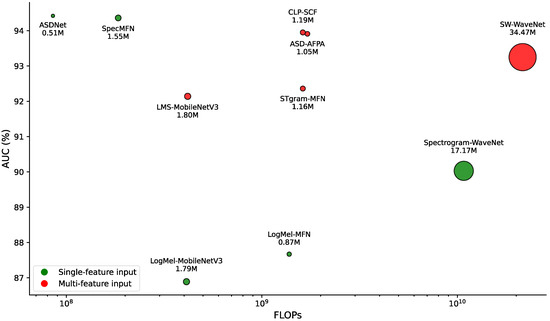 Figure 4 highlights the advantages of single-feature methods in terms of both performance and computational complexity. ASDNet and SpecMFN stand out due to their top-left positions (high AUC and low FLOPs) and small point sizes (low parameter counts), indicating their ability to achieve high performance while significantly reducing hardware costs, making them particularly suitable for resource-constrained environments. In contrast, other single-feature methods, such as LogMel-MFN [