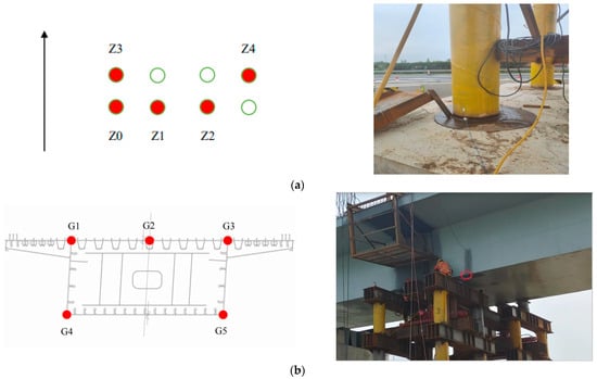 Four stress measuring points are arranged at a height of 6 cm from the bottom of each temporary pier column, and for temperature compensation, the temperature-compensated strain-gauge method is adopted and stress compensation measuring points need to be arranged, with a total of 19 stress measurement points. The 60 m steel box girder spans four segments. A stress test section is set up in the middle of each segment. Five measuring points are arranged in each test section. Meanwhile, four temperature compensation ports are configured in the stress–strain acquisition device. A stress test section is also set up at the junction of the five- and six-section girders, a total of 29 stress measuring points. At the same time, two sections are arranged at the connection between the guide girder and the steel box girder. For each section, four measuring points are placed, and overall, eight stress measuring points are positioned. One interface is on the side of the guide girder, and the other section is on the side of the steel box girder. The layout of the measuring points is illustrated in Figure 10. Z0 is the compensation strain gauge. Through these stress measuring points, the stress of each unfavorable working condition throughout the incremental launching is monitored, and the data are recorded by a JM3816 static resistance strain gauge. Finally, the stress is determined using the material’s stress–strain characteristics.