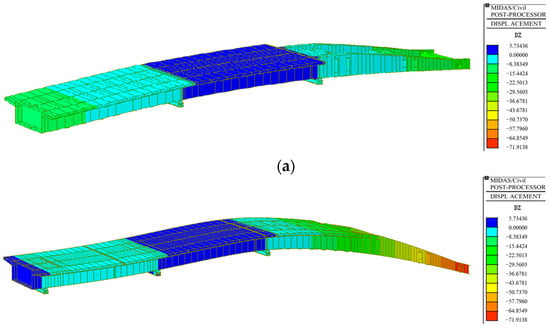 The theoretical displacements at the leading and trailing edges of the steel box girder for five operational scenarios are provided by the finite element analysis and contrasted with the monitoring data. Figure 11 shows the overall vertical deformation cloud map of the finite element simulation of the steel box girder. Table 2 shows the calculated and monitored values of the displacement of the steel box girder under five working conditions, and the displacement limit is given according to reference [12]. According to the data in the table, the displacement is within the limit value, indicating that the displacement of the steel box girder meets the safety design requirements.