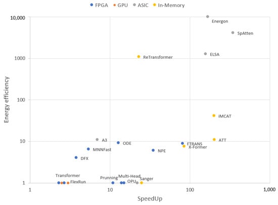 Energy efficiency refers to the total energy consumption to perform an operation compared to the reference platform. Again, each scheme is compared against different computing platforms, making it hard to evaluate the most energy-efficient solution. However, similar to speedup, ASICs and in-memory computing accelerators provide much better energy efficiency compared to FPGAs and GPUs. Energon claims up to four orders of magnitude better energy efficiency compared with CPUs and three orders of magnitude better compared to GPUs (V100). SpAtten and ELSA, both targeting a 40nm process technology, also achieve three orders of magnitude better energy efficiency compared to GPUs, thanks to algorithmic optimizations. However, as with speedup, FPGAs may offer lower energy efficiency but are readily available and can be integrated with off-the-shelf components in current data centers. Figure 1 shows the speedup versus the energy efficiency for the presented frameworks.