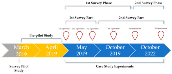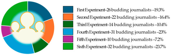 The final survey sample of this case study of six qualitative experiments consists of a convenience sample of 135 adults budding journalists (i.e., 18 years old and older) who were active media learners from higher and adult education in Greece at the time each experiment was conducted, respectively. Therefore, it can be characterized as a Catholic Greek case study. More precisely, (a) the first experiment includes 26 university students in the course “Radio Journalism”, who attended the undergraduate study program of AUTh’s SJMC in Thessaloniki during the academic year 2018–2019 (AUTh’s SJMC 1); (b) the second experiment includes 22 university students in the course “Web Radio”, who were studying in one of the then-offered postgraduate study programs of AUTh’s SJMC in Thessaloniki during the academic year 2018–2019 (AUTh’s SJMC 2); (c) the third experiment includes 14 learner students in the course “Organization–Production–Presentation of Radio Shows”, who enrolled in the sports journalism program at the Public Vocational Training Institute (Δημόσιο Ινστιτούτο Επαγγελματικής Κατάρτισης/Δ.ΙΕΚ in Greek language) (D.IEK in the official abbreviation for English language) in Sindos (Thessaloniki, Greece) (IEK from here on) during the academic year 2018–2019; (d) the fourth experiment includes 31 university students in the course “Radio Journalism”, who attended the undergraduate study program of AUTh’s SJMC in Thessaloniki during the academic year 2019–2020 (AUTh’s SJMC 3); (e) the fifth experiment includes 10 university students in the course “Web Radio”, who were studying in one of the then-offered postgraduate study programs of AUTh’s SJMC in Thessaloniki during the academic year 2022–2023 (AUTh’s SJMC 4); and, finally, (f) the sixth experiment includes 32 university students in the course “Radio Journalism”, who attended the undergraduate study program of the Department of Communication and Digital Media (DCDM from here on) of the University of Western Macedonia (UWM from here on) in Kastoria (Greece) during the academic year 2022–2023 (Figure 2 and Table 3). Unquestionably, the final survey sample is considered sufficient to cover the needs of a survey or even study (i.e., ≥100 participants) [174], as well as the corresponding survey sample size of each qualitative experiment, respectively (i.e., ≥10 participants) [175,176], thereby ensuring the validity of both the case study and each qualitative experiment, respectively [116,177,178].