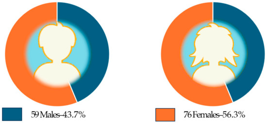 Following the budding journalists’ responses from the evaluation form, the final statistical distribution of the gender’s variable included only men and women, even though an “other” option was provided (see Section 3.2). Specifically, (a) 59 males with a percentage of 43.7%; and (b) 76 females with a percentage of 56.3% (Figure 3). Arguably, this survey finding is unexpected considering the genealogical characteristics, lifestyles, habits, behaviors, and ethos of the literature-based generational cohorts (Section 2), and particularly those of Generation Z (Section 2.3), whose members are generally considered to be open-minded [44,50,86] and constitute the majority of this survey sample (i.e., 118 Zoomer budding journalists with a percentage of 87.3%) (Table 4). Admittedly, it could be safely said that Greek Zoomers are not as open-minded as their international peers. Nevertheless, this may be an isolated survey result that requires further investigation, as a later and more recent different study conducted with the same survey sample does not appear to confirm it [179]. Furthermore, this survey finding can also be characterized as replicable, as it appears to be a common occurrence for adult woman media learners studying media studies to dominate as an overall survey sample in empirical studies, particularly in various empirical studies and surveys conducted in Greece [4,6,180]; however, this does not seem to hold true at each experiment of this survey (Table 3). In short, more details can be found in Table 3, Table 4 and Table 5 in order to have a comprehensive view of the demographics of the budding journalists who participated in this survey.