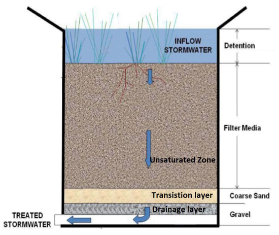 Vegetated Biofilter: In urbanized areas, biofilters are a more suitable alternative treatment, requiring less land than constructed wetlands and making it particularly suitable for local stormwater harvesting solutions. Laboratory experiments have shown that biofilters are effective at removing significant amounts of suspended solids and metals from stormwater [22,23], and these findings have been largely validated in real-world applications [24,25]. Although the removal of nutrients is another potential benefit [26,27,28], certain studies report biofilters as net contributors of nutrients, particularly nitrogen [22,23,29]. Table 3 and Table 4 outline the main elements of stormwater biofilters and the processes involved in pollutant removal.