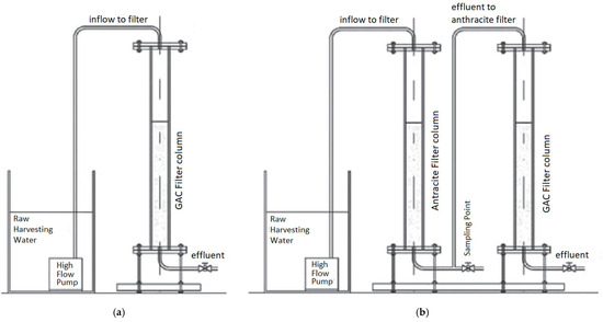 Materials and Methods on high-rate systems: A detailed on-site pilot-filtration study was conducted in Kogarah, Sydney, Australia to evaluate the performance of filters using anthracite coal and granular activated carbon (GAC) at high filtration velocities for the removal of solids, heavy metals, and organic pollutants (Figure 2). Raw harvesting water was stored in a tank (Figure 2). Samples of raw water were sourced from a stormwater harvesting facility in Sydney, Australia. The stormwater primarily came from base flow, which continuously moves through the canal during dry spells. A pit located at the base of the canal allowed stormwater to drain by gravity to a nearby wet well. From there, it was pumped through to a control valve pit where turbidity levels are monitored. Should the turbidity exceed 50 NTU, the stormwater is diverted to a return pit leading back to the canal; otherwise, it continues to the filtration plant at a flow rate of 0.7 L/s (2.5 kL/h)