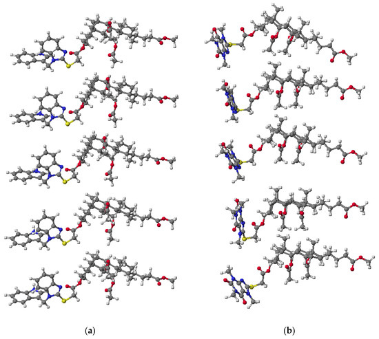 The spatial arrangement and interaction of the bioconjugates 7 and 10 are shown in Figure 2. The final heat of formation is −1655.7660 kcal/mol for 7 and –2335.0571 kcal/mol for 10, respectively. The molecules of bioconjugates are arranged to form a specific kind of channel through which ions or neutral molecules can be transferred. Compensation charges occur only through intermolecular electrostatic interaction. This is a very good confirmation of the conclusion that interactions reduce HOF.