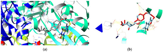 (a) The depiction of possible hydrogen bond formation between bioconjugate 8 and 6RZ4 protein domain. (b) The 2D depiction of interactions between bioconjugate 8 and 6RZ4 protein domain. Cyan lines with big dots—pi–pi interactions, green solid lines—hydrophobic contacts.