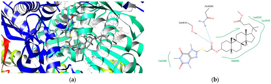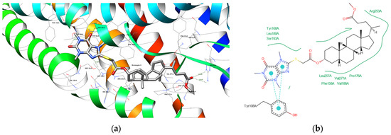 Both caffeine and gramine have been used to synthesize hybrid compounds. An interesting example of a caffeine hybrid is the combination of caffeine with Eddystone D. This unique combination results in a compound with a higher affinity for adenosine receptors than caffeine alone [33]. Gramine–uracil and gramine–imidazole hybrids show cytoprotective effects against AAPH-induced oxidative hemolysis [34,35]. Steroid–gramine bioconjugates with a triazole linker are examples of hybrids with potential antibacterial and antifungal activity [36]. In view of the above, we plan to synthesize the unique steroid–gramine bioconjugates and evaluate their pharmacological activities using the in silico program PASS (Pharma Expert Predictive Services ©2011–2013, Version 2.0.), a widely accepted tool for predicting biological activities. The lack of literature reports on the synthesis of caffeine–steroid hybrids prompted us to extend our studies to the caffeine molecule. Considering the promising potential of the new compounds as biologically active agents, their selected biological activity was evaluated using molecular docking methodology. Furthermore, to ensure the comprehensive nature of our research, PM5 calculations were performed for all compounds.