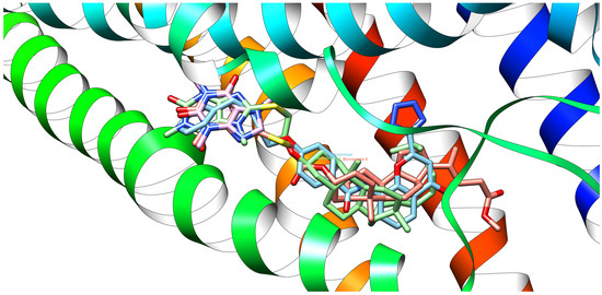 Native ligand (atorvastatin, grey-colored) and new ligands: bioconjugates 1 (pink-colored), 3 (bittersweet-colored), 4 (cyan-colored), and 8 (green-colored) at once in the binding site of the 1HWK protein domain. The new ligands occupy the same space as the native ligands.