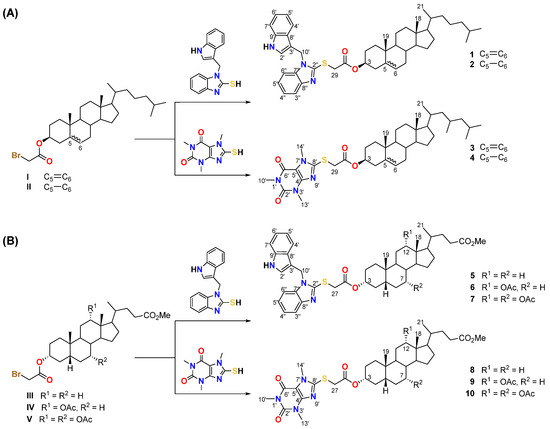 Synthesis of new sterol–alkaloid bioconjugates 1–4 (A) and bile acid–alkaloid bioconjugates 5–10 (B).