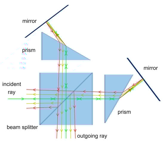 Figure 1. Layout of the interferometer of a typical prism-based spatial heterodyne spectrometer (SHS) [19]. A point source containing three wavelengths is set. Arrows of different colors represent rays with different wavelengths.