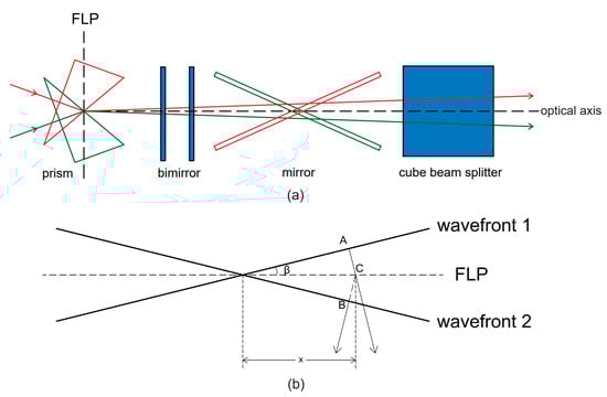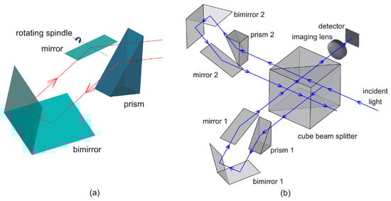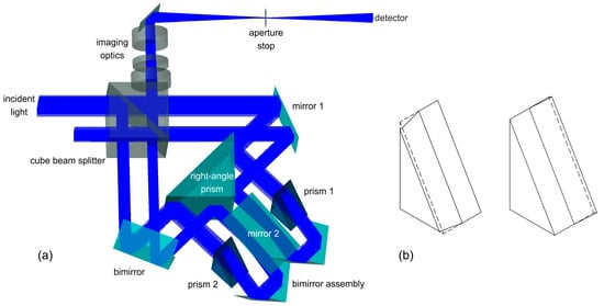 To realize this idea, we propose to use a prism–bimirror–mirror assembly instead of the prism–mirror structure in each arm, as shown in Figure 2a, with the angle made by the two planes of the bimirror being a right angle. The collimated light is split by a beam splitter and is divided into two paths. Now we will describe only one of the paths. The beam is incident vertically into a prism and refracted at its exiting surface. Then, the beam is incident to one of the planes of the bimirror. The intersection line of the two planes of the bimirror is perpendicular to the incoming axis of the bimirror and parallel to the side surfaces of the prism. In terms of the direction of the beam, a right-angle bimirror is equivalent to a mirror, except that the beam is shifted by an extra segment of the optical axis between the incoming and outgoing axes, which staggers the incoming and outgoing beams.