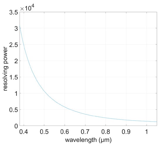 The variation of the theoretical spectral resolving power of the spectrometer is shown in Figure 4. The theoretical spectral resolving power in the spectral range (10,000 cm−1~25,641 cm−1) is approximately 1381~27,595; that is, the highest spectral resolution is approximately 0.014 nm/390 nm (0.93 cm−1/25,641 cm−1). In some applications, the required spectral resolving power differs in different spectral ranges, allowing the selection of the appropriate material and apex angle for the prisms accordingly.