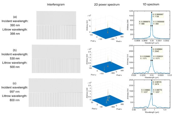 First, the wavelength of the incident light is set to 390 nm and the Littrow wavelength is set to 398 nm (the angle of mirror 2 tilt is set to 20.99° according to Section 2.4 and the bimirror assembly is tilted at twice the angle of mirror 2). The interferogram received by the detector, the 2D power spectrum obtained by 2D Fourier transform of the 2D interferogram, and the 1D spectrum obtained by 1D Fourier transform of the 1D interferogram are shown in Figure 6; the upper half of the interferogram is the 2D interferogram and the lower half is the 1D interferogram. Since the impact spectrum of the 2D power spectrum is located in the second and fourth quadrants, only the portion of the 1D spectrum that is smaller than the Littrow wavelength is intercepted. From the 1D spectrum, the full width at half maximum (FWHM) is about 0.019 nm, which is close to the theoretical maximum spectral resolution of 0.014 nm calculated from Equation (12).