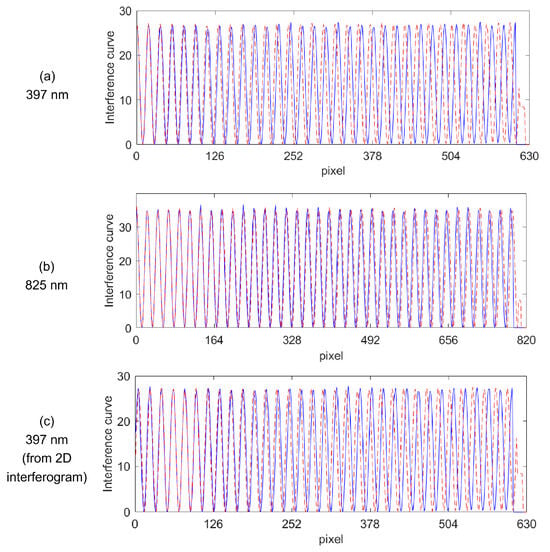 To verify the FOV, a 1D interferogram of the limiting off-axis rays is traced in ZEMAX. The wavelength is set to 397 nm because the usable FOV at this wavelength is close to that of the instrument and the interference curve is easy to observe. The angles of the off-axis rays are calculated according to Equation (14); for example, ϕ = 0.052° and φ = 0.1°. Figure 7a shows the interference curves for the on-axis rays and the limiting off-axis rays. The 0th pixel is the center of the detector. It shows that the OPD changes by about 1/2 of the wavelength at the edge of the fringe pattern, which is consistent with the theoretical result. To verify that the usable FOV of the instrument is applicable across the spectral range, another wavelength of 825 nm is set, as shown in Figure 7b. The OPD changes less than 1/2 of the wavelength. To verify that the usable FOV also applies to 2D interferograms, the curves of a row of the 2D interferograms at 397 nm are shown in Figure 7c. The OPD changes by about 1/2 of the wavelength.