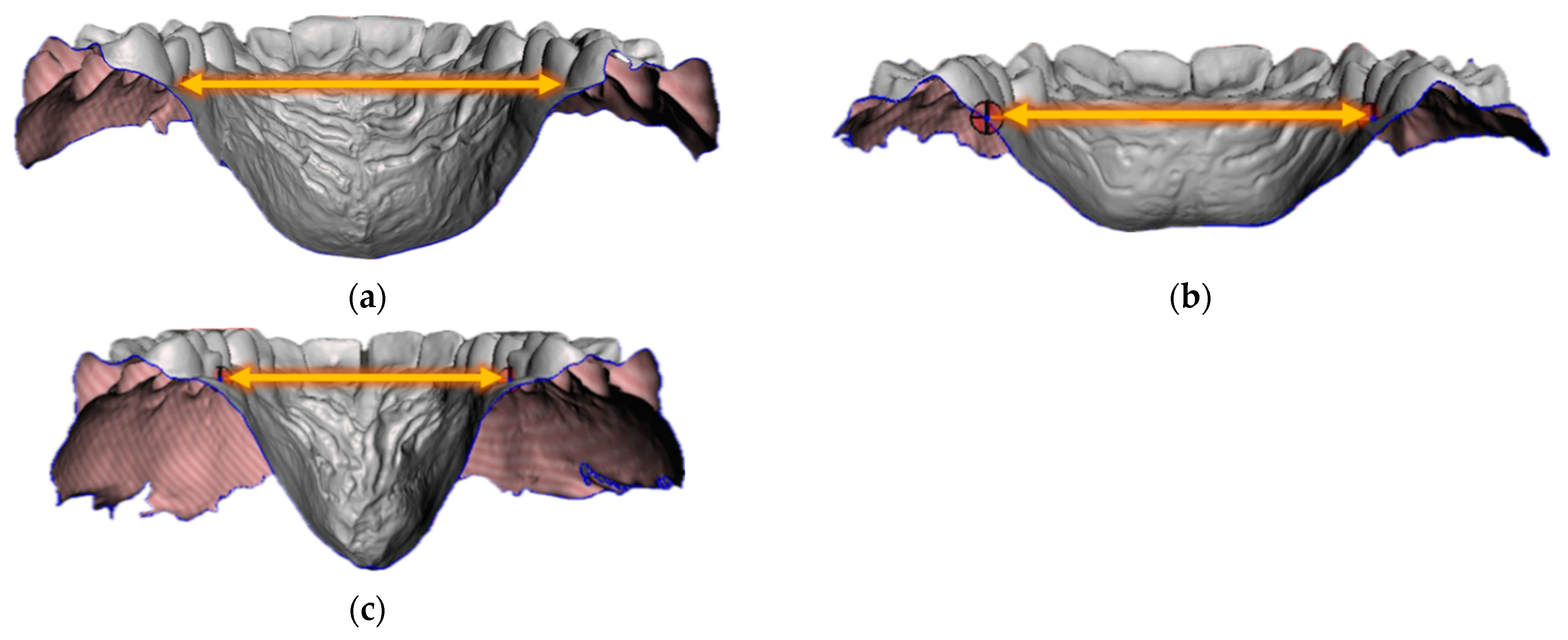 - Staley, R.N.; Stuntz, W.R.; Peterson, L.C. A comparison of arch widths in adults with normal occlusion and adults with class II, Division 1 malocclusion. Am. J. Orthod. 1985, 88, 163–169. Available online: https://api.semanticscholar.org/CorpusID:35044757 (accessed on 9 December 2023). [CrossRef]