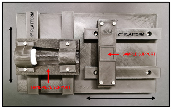 The CPT consists of two platforms. The first platform secures the handpiece, ensuring consistent pressure is applied to the samples during polishing. The second platform stabilizes the sample on a support with predefined dimensions (20 × 20 × 3 mm). A track mechanism enables the movement of the first platform across the sample, maintaining a parallel alignment between the handpiece and the base of the prototype (Figure 1). The design ensures that the sample’s surface is polished uniformly along its support. By employing this device, the polishing process is standardized and controlled, effectively eliminating operator-dependent variables.