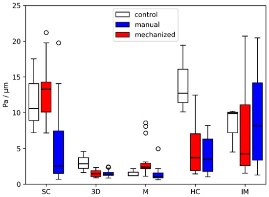 Distribution and dispersion of Pa/μm with control group (SC—self cured, 3D—3D printed, M—milled, HC—heat cured, IM—injected molded).