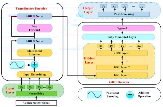 In this paper, we propose a sequence-to-sequence model-based Transformer-GRU to generate 0–1 sequences for axle recognition and time positioning. Figure 1 shows the overall architecture of the proposed sequence-to-sequence model, which consists of an input layer, a Transfromer encoder, a GRU decoder, and an output layer.