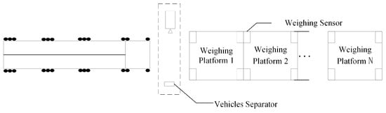 The modular WIM system consists of three main parts: a sensor module to obtain weighing signals, a data acquisition module to send signals, and a master control module to calculate the number of axles, axle loads, and gross vehicle weight. The innovative design of the sensor module is a key feature that makes the modular WIM system different from other WIM systems. Its structure is shown in Figure 2. Along the traveling direction of the vehicle, there are a vehicle separator and N groups of weighing platforms, and each weighing module contains four bridge strain weighing sensors installed at the four corners of the platform. Weighing platforms operate independently, meaning that each platform can weigh on its own, or that multiple connected platforms can be combined to achieve weighing. The cascade structure design can help achieve two goals: one is continuous weighing with multiple vehicles traveling through platforms simultaneously, and the second is the whole-vehicle-load measurement of common vehicles.