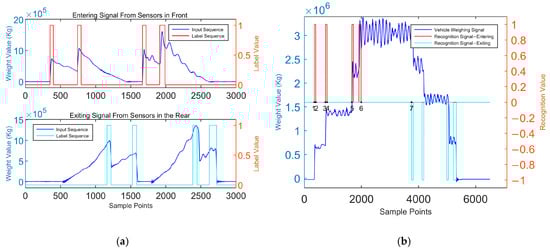 (a) Input-label sequence for axle recognition model; (b) combined weighing signal and axle recognition signals.