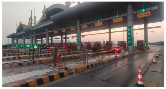 The speed of the vehicles in this toll station lane (Figure 6) ranged from 0 to 30 km/h. In total, 9250 vehicles’ axle recognition results were recorded. The actual axle number was determined through a manual review, and the model results are presented in Table 4.