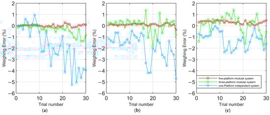 It can be seen from Table 6 and Table 7 that the standard deviation and error fluctuation amplitude of the five-platform modular system were the smallest. Compared with the five-platform modular system, the standard deviation and error fluctuation amplitude of the three-platform modular system were up to 11.71 times and 10.95 times, respectively. The one-platform system increased by 15.53 times and 17.4 times, respectively. It was demonstrated that the modular system exhibited significant advantages over the independent system in terms of weighing consistency. In the three-platform modular system and one-platform system, both the standard deviation and error fluctuation amplitude increased significantly with an increase in the axle number. By contrast, the five-platform modular system exhibited only slight fluctuations, and was more stable and reliable. This is mainly due to the advantages provided by the whole-vehicle weighing method and sufficient weighing time.