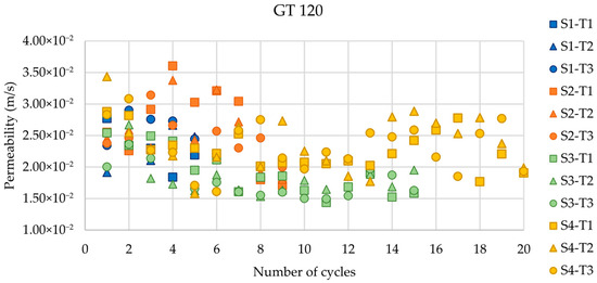 The permeability test results graphs are presented in Figure 2 and Figure 3 for the GT120 and GT300 results, respectively. To interpret the graphs, it is necessary to know that “S” was used for the sample and “T” for the reading trial. Therefore, S1-T1 is the permeability of sample 1 (S1) and first test (T1); since the tests were very fast, they were performed in triplicate, resulting in T1, T2 and T3 for all samples.
