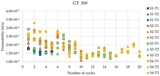A very similar behavior is observed in the GT300 experiment (Figure 3). Both tested samples experience an increase in permeability, followed by a period of stabilization, and then the permeability decreases again. Overall, the permeability of both types of geotextiles remained virtually unchanged throughout the 20 cycles, indicating that bioclogging was negligible during the approximately 80-day operating period, which contrasts with the results of [16,17,18] who found clogging in the order of 10−4 to 10−9. This suggests that, within this time interval, the ability of the geotextiles to allow water flow was not compromised by biofilm formation or other biological clogging processes.