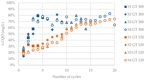 In the first five cycles (approximately 20 days of operation), COD removal increased significantly, reaching up to 79% in GT300 and approximately 34% in GT120. Stabilization in COD removal for GT300, indicating steady-state conditions, was observed only after the tenth cycle. Between the fifth cycle (20 days of operation) and the twentieth cycle (52 days of operation), the average COD removal efficiency for the GT300 was 72%.