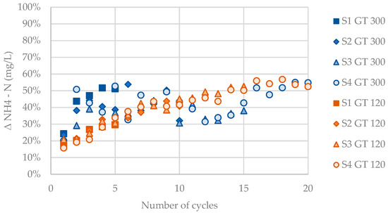 Regarding the removal of nitrogen in the form of ammonia (Figure 5), the removal efficiency in GT300 varied from approximately 22% to 40% in the first two cycles (8 days of operation) and stabilized after the third cycle (12 days of operation). For GT120, equilibrium conditions were reached around the tenth cycle (40 days of operation), presenting a greater variation in efficiency between the fourth and tenth cycles (16 to 40 days of operation). Despite this difference in time to stabilization, the final average removal efficiencies for both geotextiles were similar, at around 40%. This indicates that, although GT300 reaches a stable efficiency more quickly, both colonized materials are equally effective in removing ammonia–nitrogen in the long term.
