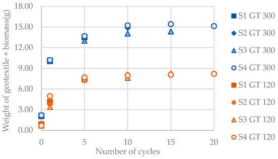 Finally, at the end of each cycle, the filters were weighed to assess biomass growth (Figure 8). It is important to note that the geotextiles were initially weighed wet only with distilled water to ensure that the subsequent weight exclusively reflected the increase due to biomass growth. In the first five cycles, the GT300 showed an increase of 8 g, stabilizing at 15 g in the tenth cycle. In comparison, the GT120 had a mass increase of approximately 3 g in the first five cycles.