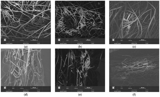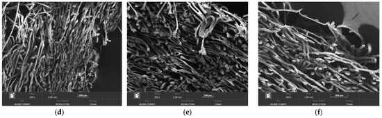 The following figures show the results found for the GT300. In Figure 14, the top view (Figure 14a–c) shows an initial biofilm formation, with the presence of microorganisms dispersed throughout the surface of the geotextile, with greater accumulation in the middle and edge regions. The structure of the mesh is still visible and there are no significant signs of clogging. The cross-section reveals a thin layer of biomass, mainly in the edge region, indicating the beginning of microbial colonization. Comparing qualitatively, it can be said that, for the sample chosen for the SEM, the GT300 presents a higher concentration of microorganisms than the GT120 for the time tested.