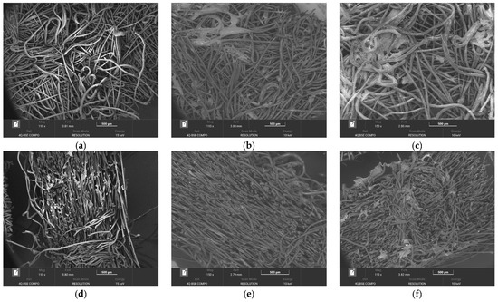 The samples were fixed using a buffer solution and glutaraldehyde for a period of 24 h. Subsequently, the samples were dehydrated in alcohol and initially immersed in a 50% alcoholic solution (half the volume in water and half in alcohol). The geotextiles were then immersed in concentrations ranging from 50 to 100% with progressive increases of 10%, a methodology used by [19]. After dehydration, the samples were fixed to the drying racks. Each geotextile sample tested was evaluated in three regions: the central part of the sample, the middle part, and the edge. In addition, a cross-section of each of these regions was performed.