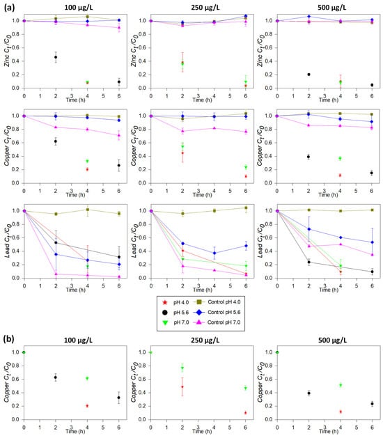 (a) Variation of the normalized concentration (Ct/C0) of Zn(II) (upper line graphics), Cu(II) (middle line graphics), and Pb(II) (bottom line graphics) as function of time (0–6 h), with the respective standard deviation, for initial concentrations of 100 µg/L (left column), 250 µg/L (middle column), and 500 µg/L (right column) and for different pH values (4.0, 5.6, 7.0). (b) Variation of the corrected, normalized concentration (Ct/C0) of Cu(II) as function of time (h), with the respective standard deviation, for initial concentrations of 100 µg/L, 250 µg/L and 500 µg/L and for different pH values (4.0, 5.6, 7.0).