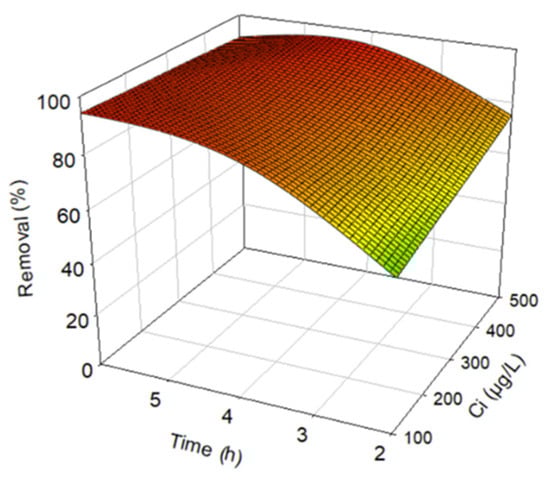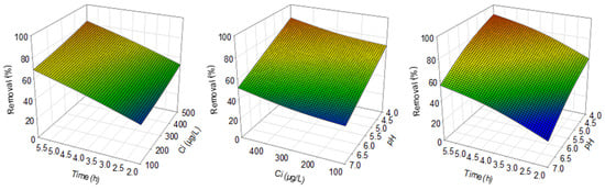 where t is the contact time (h), pH is the initial pH of the solution, and Ci is the initial concentration of Cu(II). Figure 3 shows the response surfaces obtained from Equation (5) for Cu(II) removal (%), showing the interaction between the removal percentage, time (h), pH, and initial concentration (μg/L). The relationship between the predicted and experimental values of removal percentages was shown to be linear with a strong correlation (R2 = 0.9437; see Supplementary Materials Figure S3), confirming that the chosen model is appropriate for estimating copper removal.