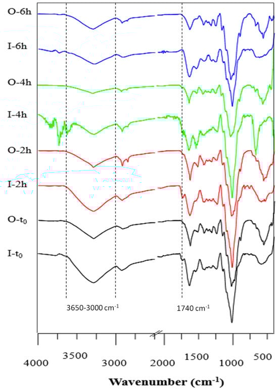 FTIR-ATR spectra of inner (I) and outer (O) sides of bean peel after the contact time of 2 h, 4 h, and 6 h with the mixture solution of PTEs, in concentrations of 500 µg/L at pH 5.6. The t0 is the time before the bean peel came in contact with the solution of PTEs.