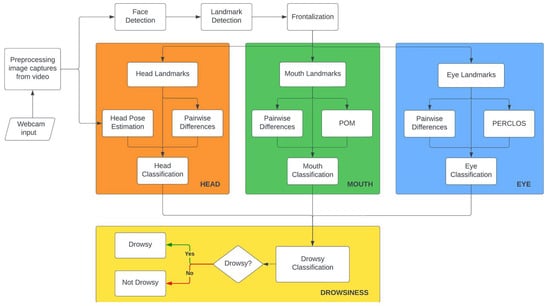 Furthermore, the detected features were first fed into multiple models for each facial area. Features related to the eye are fed into a model to detect the status of the eyes according to whether the eyes are sleepy or not. Features related to the mouth are fed into another model to detect the status of the mouth—if the mouth is yawning, still, or talking—and another model is fed features related to the head to detect whether the head is still nodding or looking to the side. From the results of these three trained models, the predictions will then be fed into another model to perform the classification of drowsy or non-drowsy. This is shown in the flowchart in Figure 2.